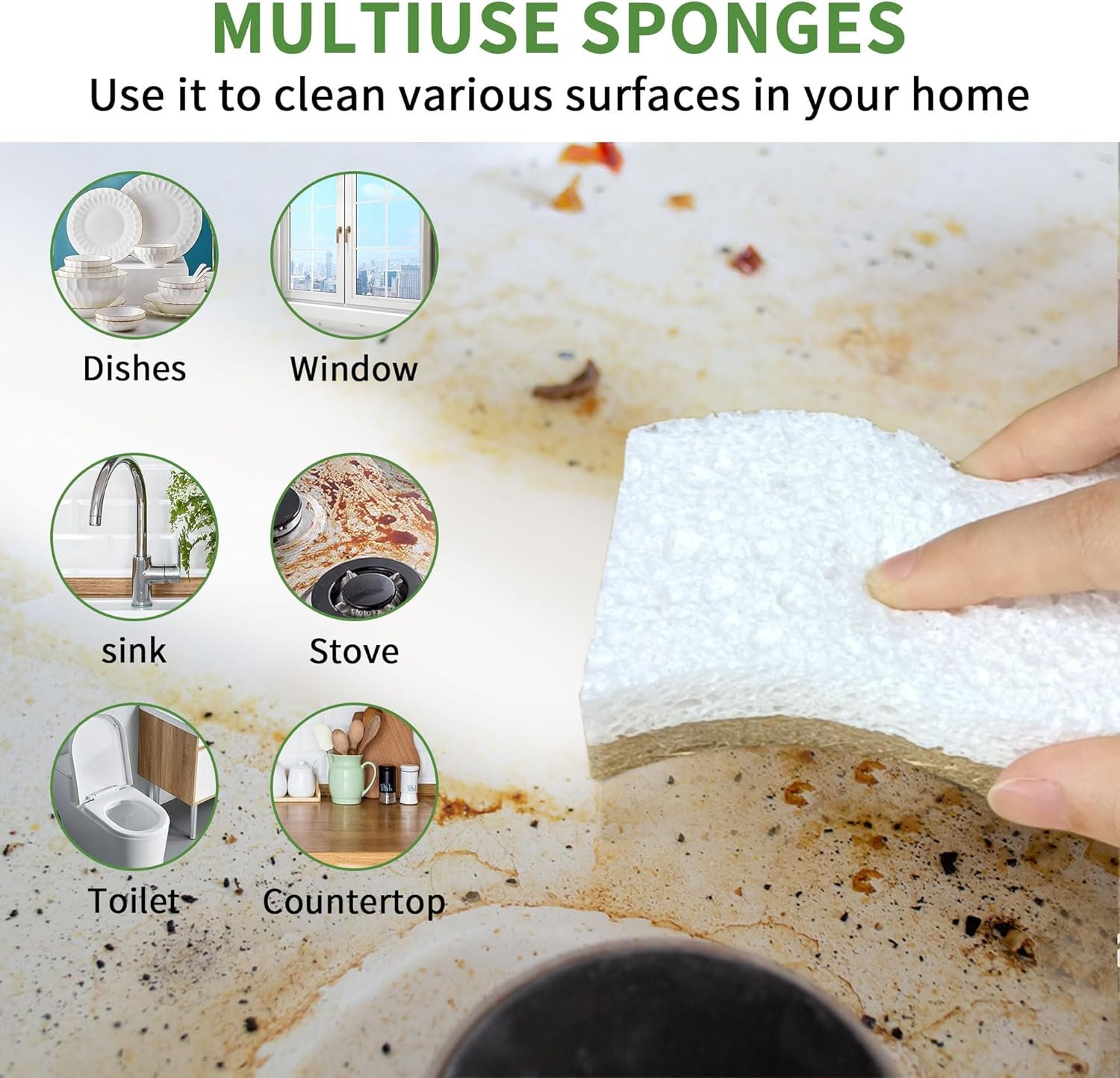 NON-SCRATCH MULTIPURPOSE SPONGES: Safely scrub your dishes and even delicate surfaces without worrying about unwanted scratching. This eco kitchen sponge can help you gently yet effortlessly wipe away grease, dirt, grime, and other impurities, keep your kitchen and bathroom sparkling clean.Premium scrubbing side cleans without scratch, safe to be used on non-stick cookware, the non-abrasive white cellulose sponge wipes away dirt and particles, can be used with dishwashing liquid if preferred
