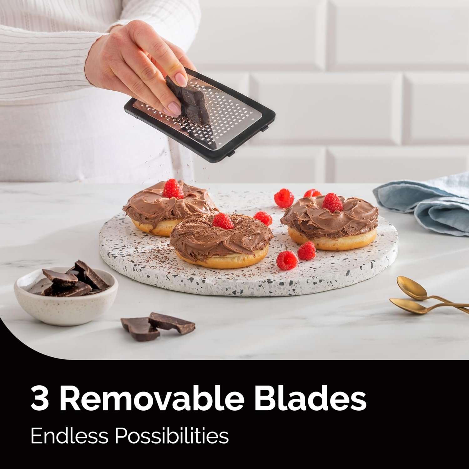 Effortless Blade Switching. This kitchen grater offers 3 different grating surfaces: coarse, medium, and fine. Switching between surfaces is zero-hassle, with no need for multiple different graters. The compact design fits conveniently into drawers and saves you kitchen space.