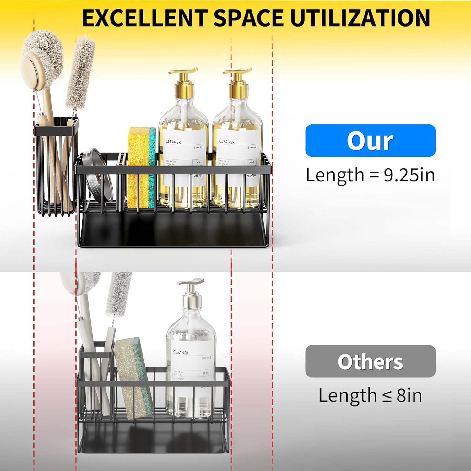 Excellent caddy for preventing water mess on counter. Holds the just right amount of items & is some what adjustable in lower holding area. Perfect for the smaller kitchens in apartments, older houses & cottages. They do offer a larger size for those with larger kitchens. Water sheds right back into sink without taking up in the sink space. Also allows items to completely air dry helping to prevent that awful sponge stink. But it’s always good too soak the heads of scrub brushes & sponges in a diluted water/bleach solution to keep them disinfectanted, clean & stink free anyway.