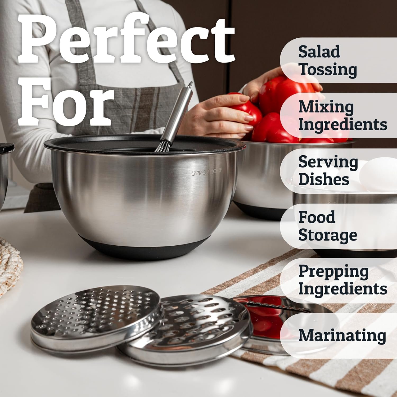 The Priority Chef Stainless Steel Mixing Bowls with Lids Set has been a great addition to my kitchen, and the best part is definitely the lid with the built‑in cheese grater. It makes prepping ingredients so much easier and keeps everything contained—no mess on the counter.The bowls themselves feel sturdy, the airtight lids snap on securely, and the three different grater attachments give you options for whatever you’re making. Super convenient and well‑designed.Highly recommend this set for anyone who wants quality mixing bowls with smart, useful features!