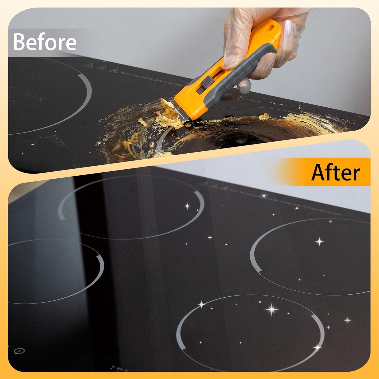 Perfect for use on glass, ceramic, and induction stovetops and cooktops, and is great for removing burnt food and gunk, as well as scraping off in the bathroom. It is also effective for removing a variety of other materials, including window paint, shims, paints, stickers, coloring film residues, wallpaper, and borders around the house