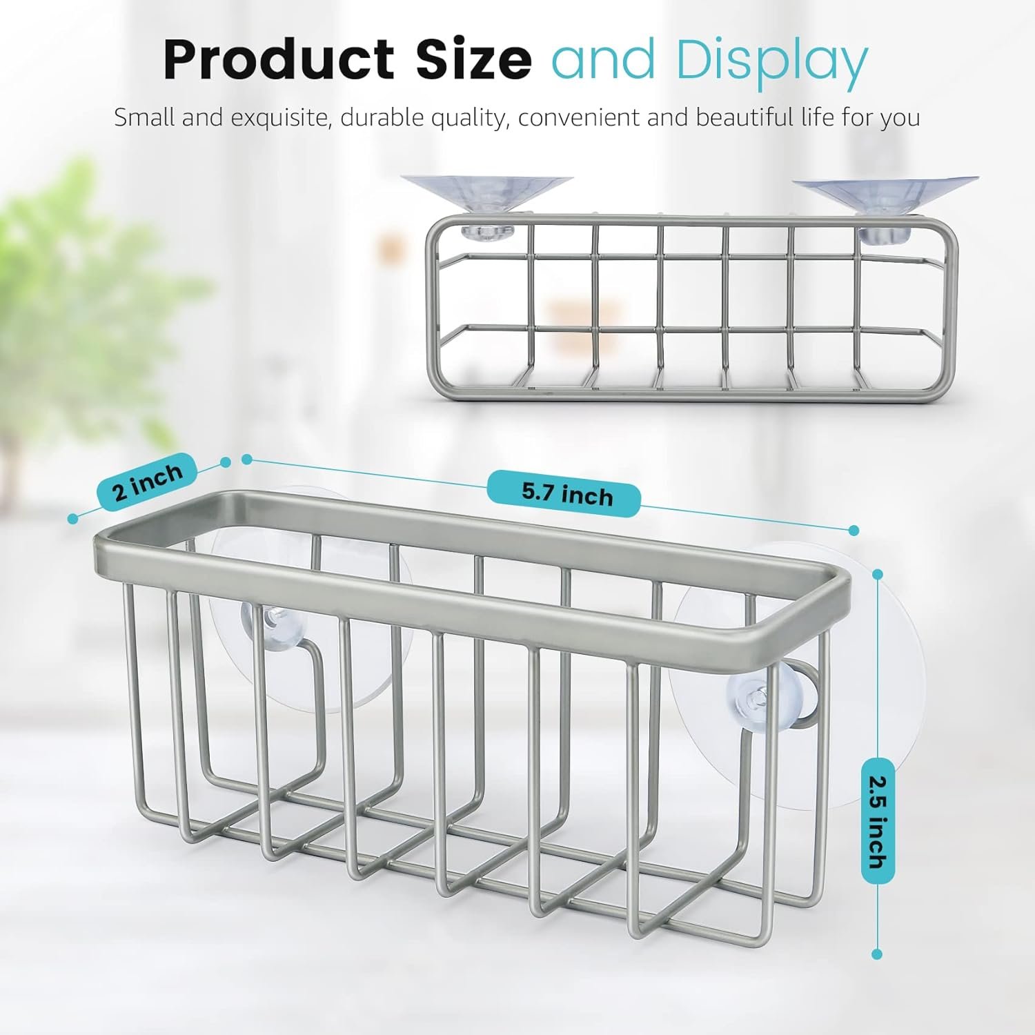 Multi-Purpose:Sponge holder for kitchen sink accommodate sponge, scrubber, scouring pad, drain stopper etc.Dimension: 5.7*2*2.5 Inch.