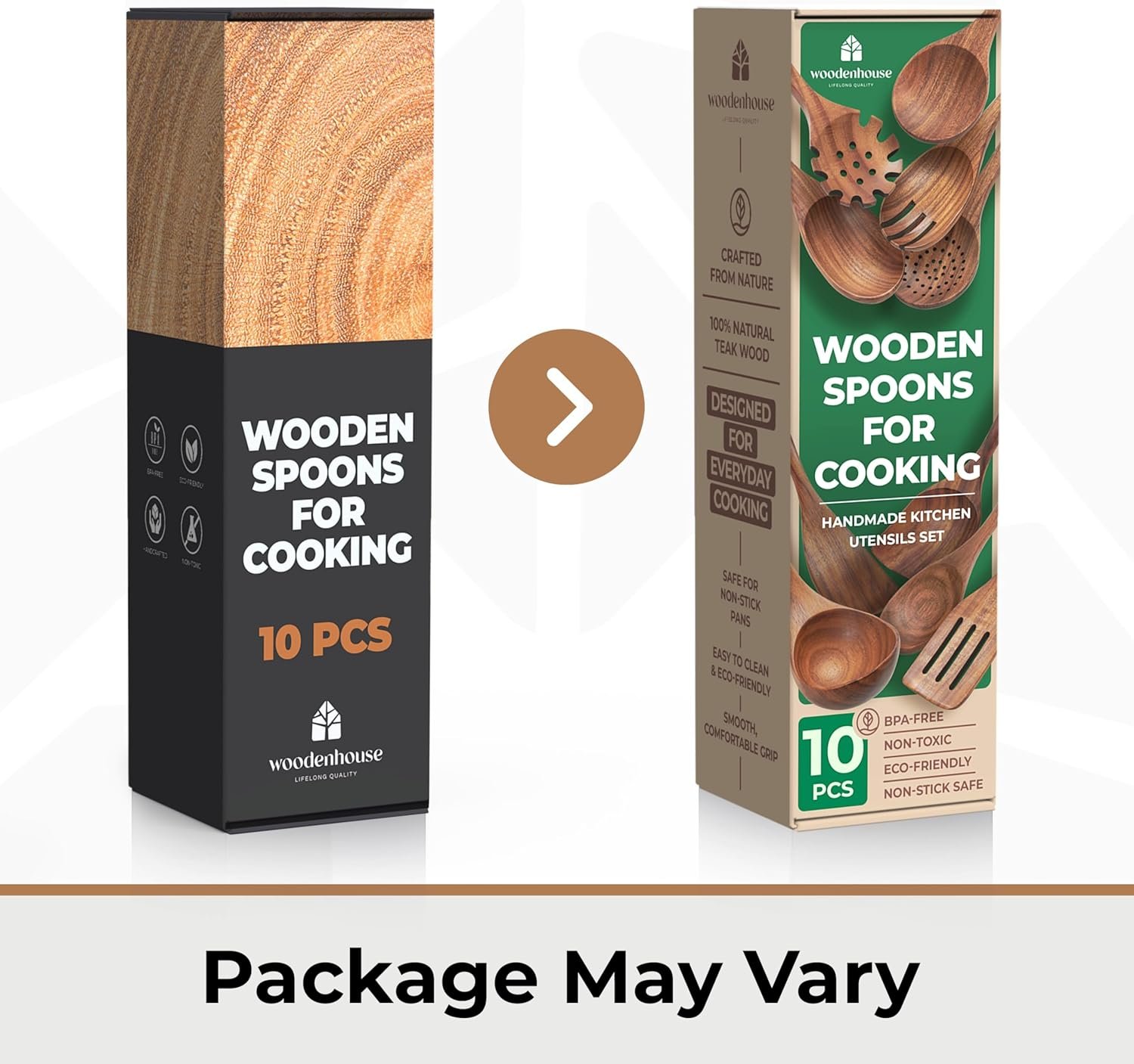 100% NATURAL TEAK WOOD : Woodenhouse kitchen utensils set wood will last a lifetime, they are made of one piece 100% Natural Teak Wood. These tools are beautiful, solid, sturdy, smooth, well designed and have a superb finish. This set will not crack, melt or smell. Utensils may vary in shade because of its natural material.