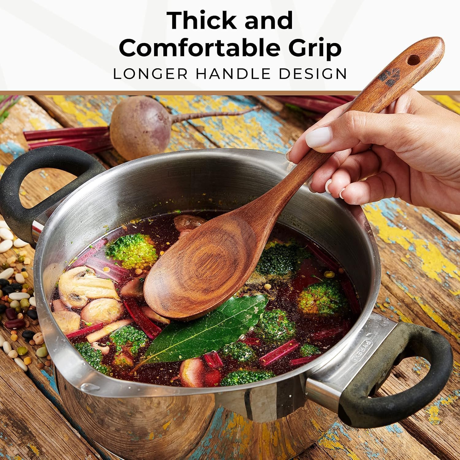 SAFE & HEALTHY TO USE: This wooden kitchen utensil set has smooth surface that’s comfortable to hold and stir. Our wood utensils set for cooking with are also non-reactive and will not transfer any chemical and metallic taste to your food.